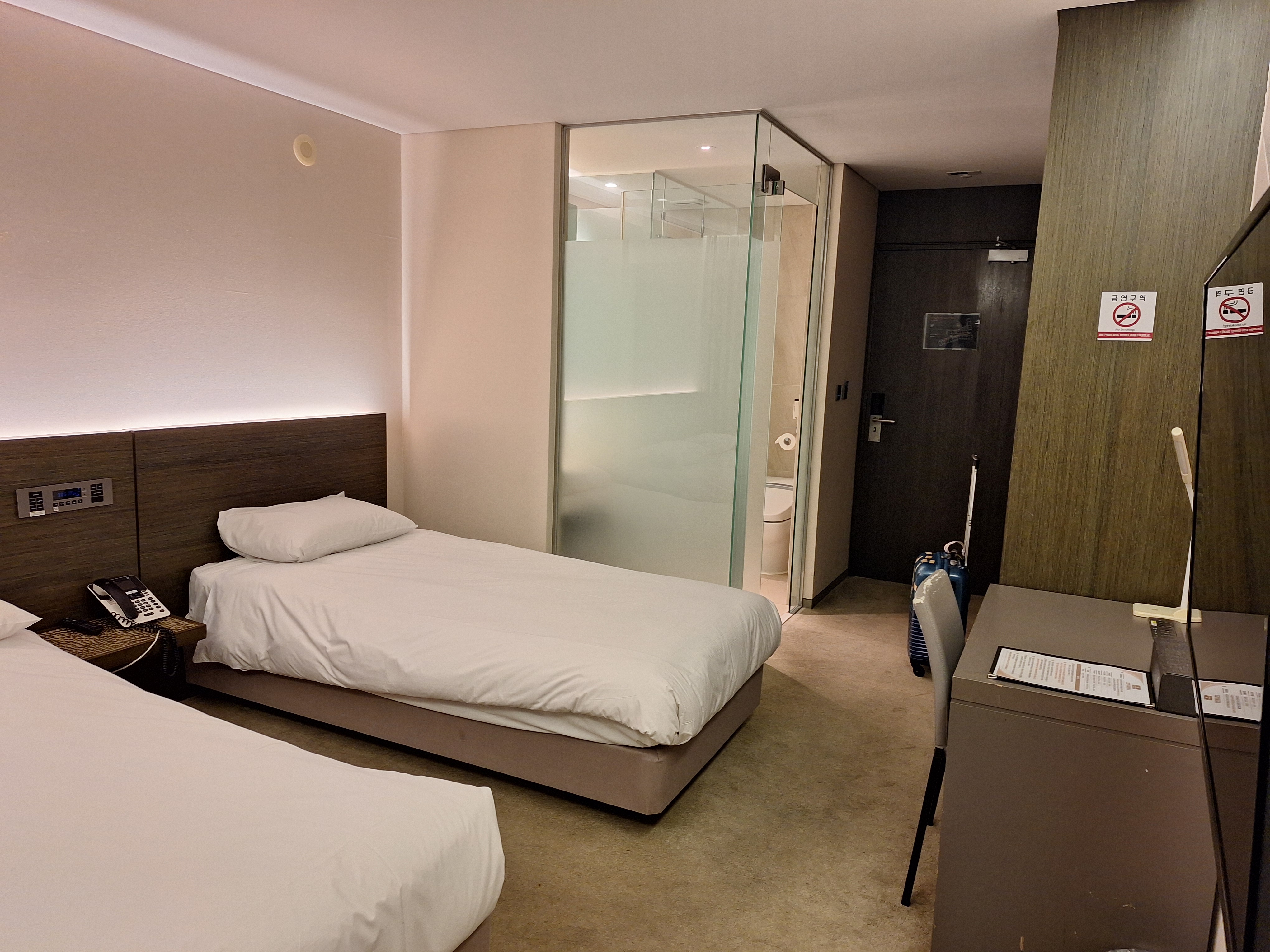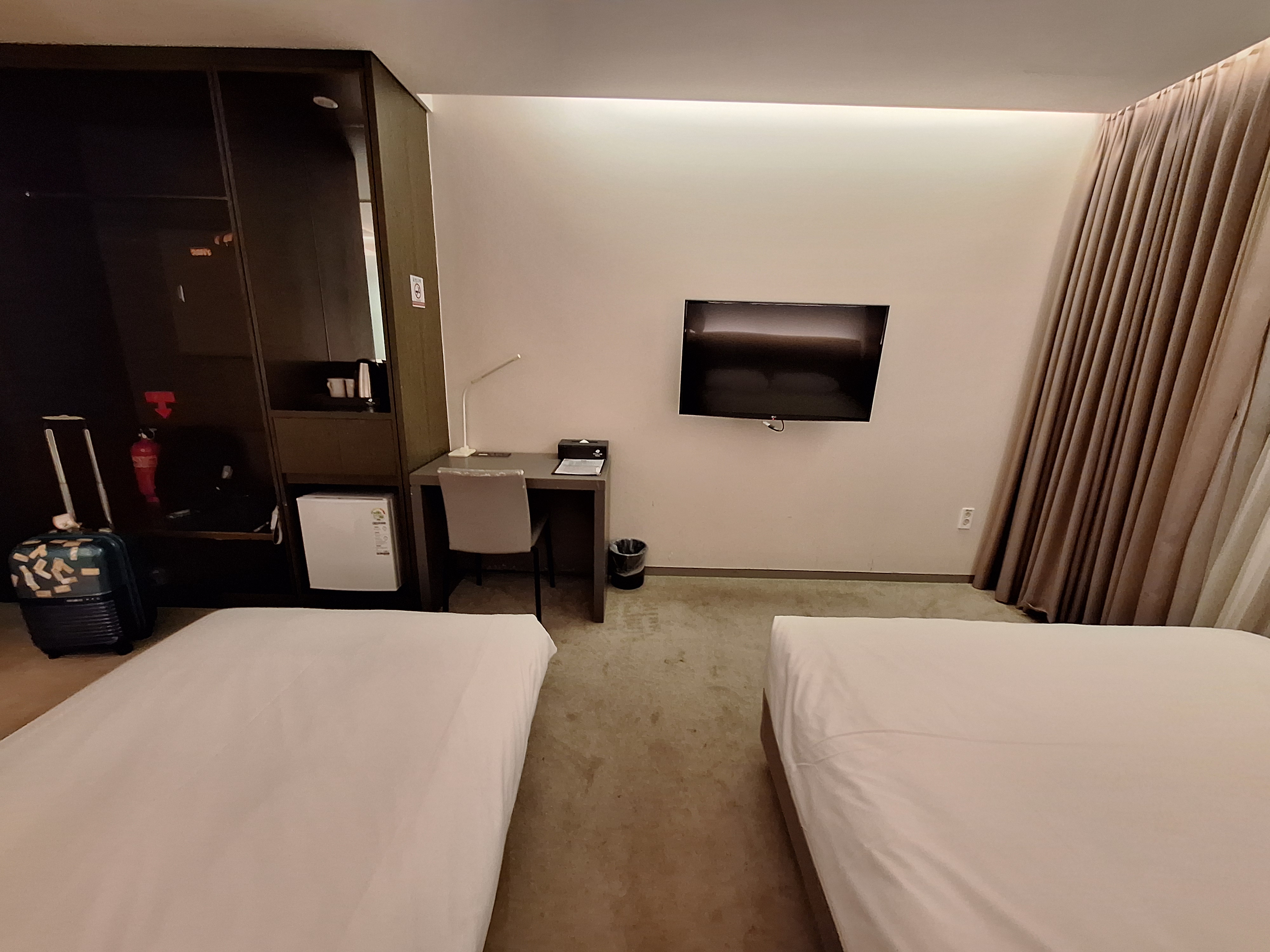 객실로 딱 들어오면 저기 멀리 침대가 있고, 의자는 좀 오래된 의자 같다.