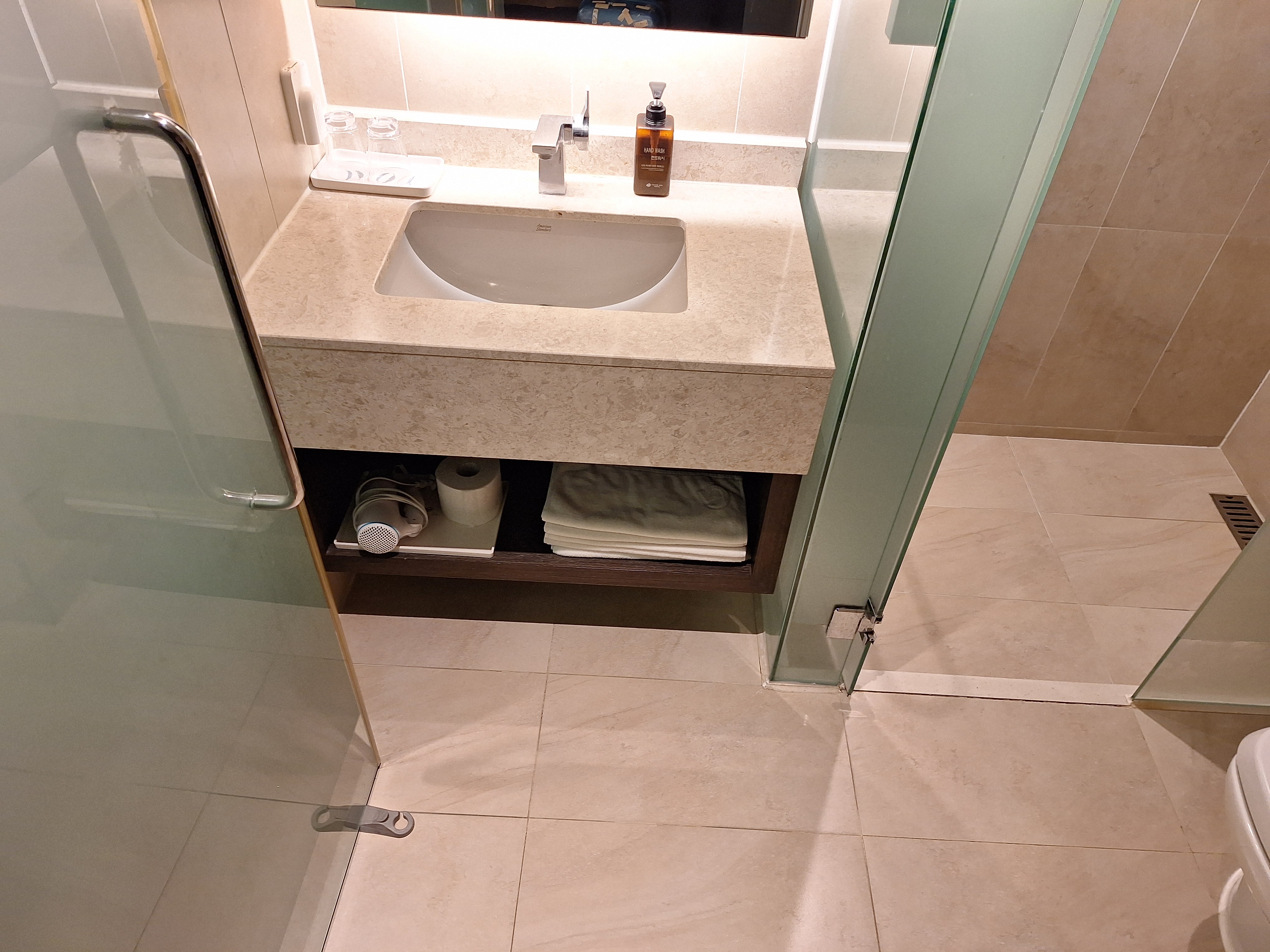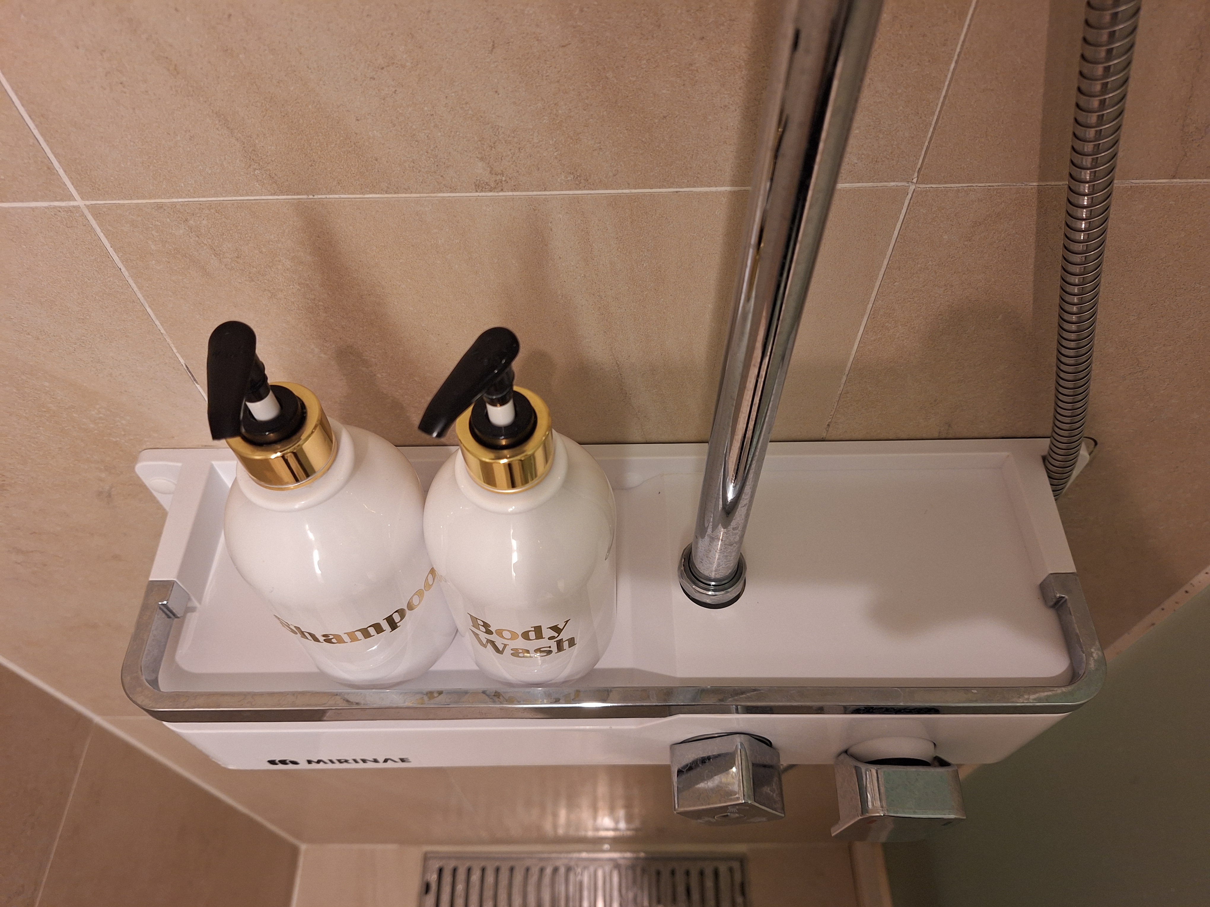 욕실의 청소 상태는 만족, 샴푸와 바디워시가 제공된다.