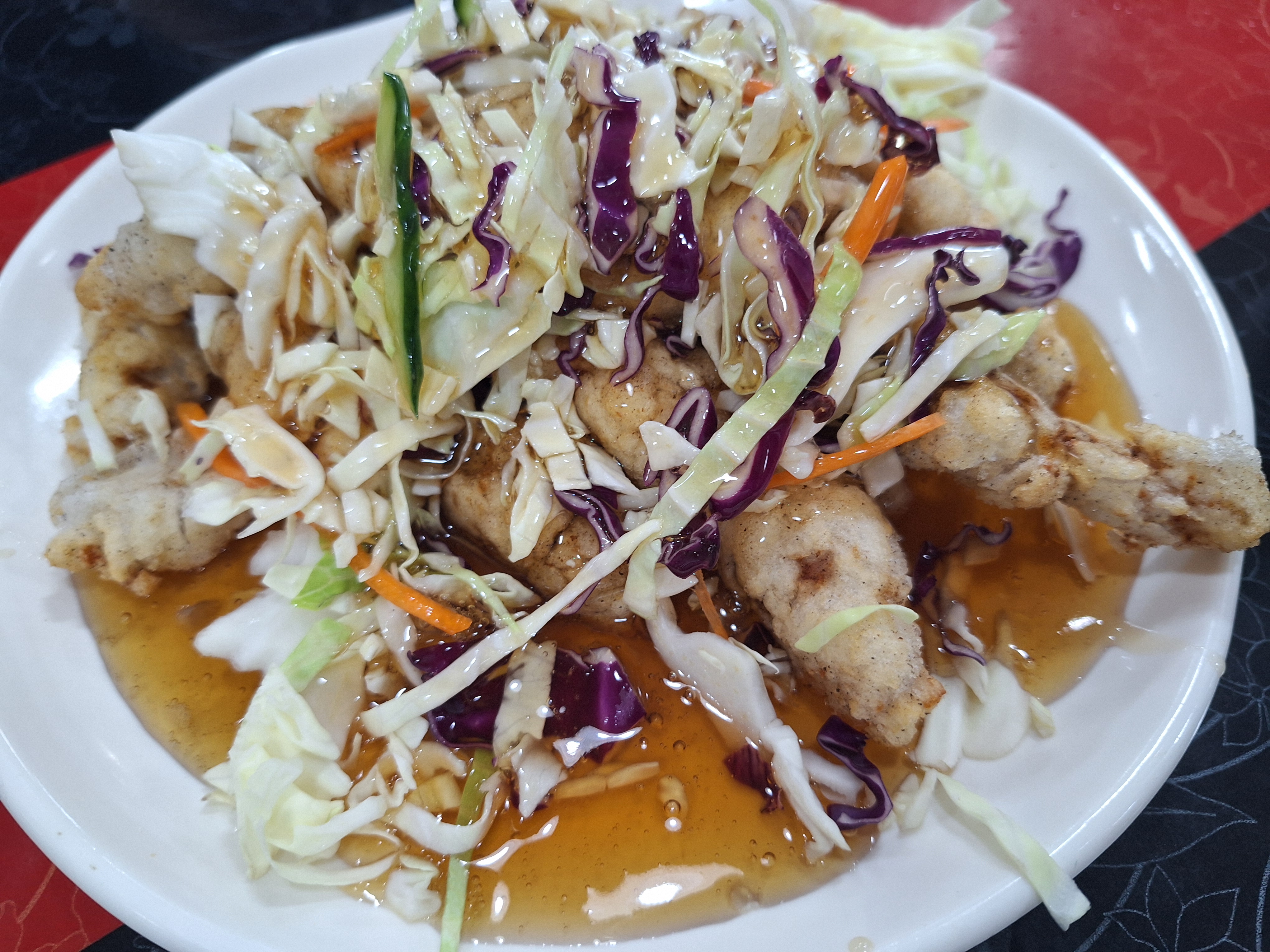 튀긴 돼지고기를 달콤한 소스와 함께 제공하는 요리로 보통 바삭한 식감의 고기와 함께 다양한 채소가 곁들여지며, 소스는 일반적으로 달콤하고 시큼한 맛이 특징