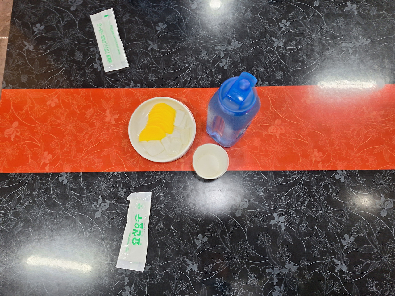자리에 앉으면 이렇게 셋팅을하는데 양파나 단무지가 부족하면 셀프로 퍼오면 된다.