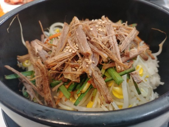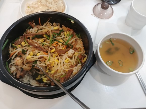 제가 제일 좋아하는 매뉴입니다, 소고기와 콩나물이 들어있는 돌 솥밥.. 밥은 잘구워져서 누룽지가 있구요 고소한 소고기 맛이 일품.. 직장동료들 여기오면 이것만 시키는 듯 ㅎㅎ